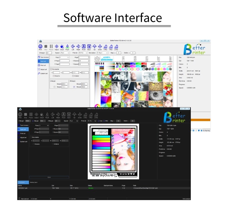 | RIP-software | Mainstream RIP software such as MainTop, Photoprint, UltraPrint, ONYX, Wasatch, etc. | Function support | Equipped with RIP function, multiple printing, multiple order cycle printing, anti-collision printing, automatic height measurement, change point printing, equipment power-off printing, automatic reset, disconnected printing, paper shortage detection, ink stack self-test, etc |