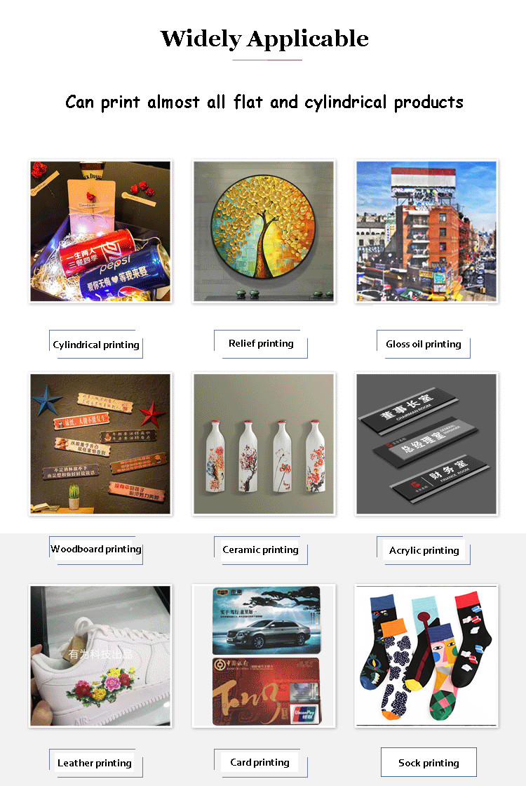 UV flatbed machine,Photo machine, white ink scald transfer machine,double-station direct printing machine,cylindrical printer, etc.