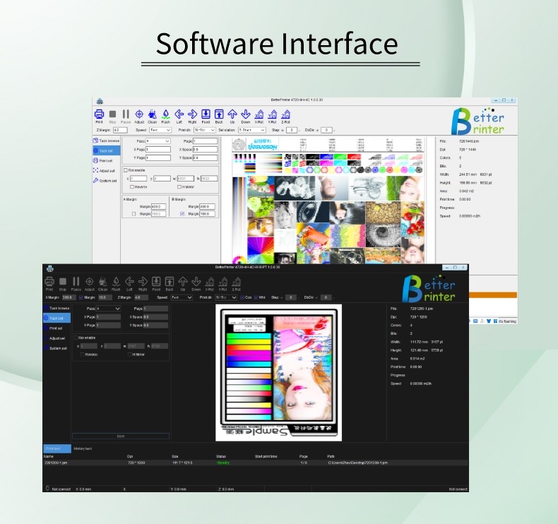 5. Function support: Equipped with RIP function, multiple printing, multiple order cycle printing, anti-collision printing, automatic height measurement, change point printing, equipment power-off printing, automatic reset, disconnected printing, paper shortage detection, ink stack self-test, etc.